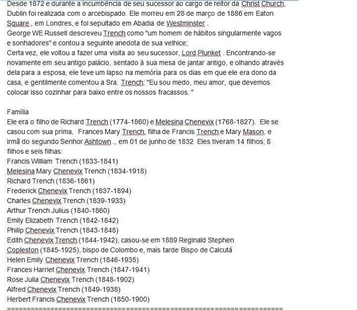 Outro relato das primeiras gerações da família na Irlanda, em desacordo com a maioria das contas, deu Thomas Trench, filho de Adão-Thomas la Tranche como a trincheira que se casou com sua prima Anne, filha do Rev. James Trench e teve dois filhos Frederick e John. [viii] (Essa conta deu Rev. James como o segundo filho de Frederico de la Tranche e Adam-Thomas como o filho mais novo.) [ix]